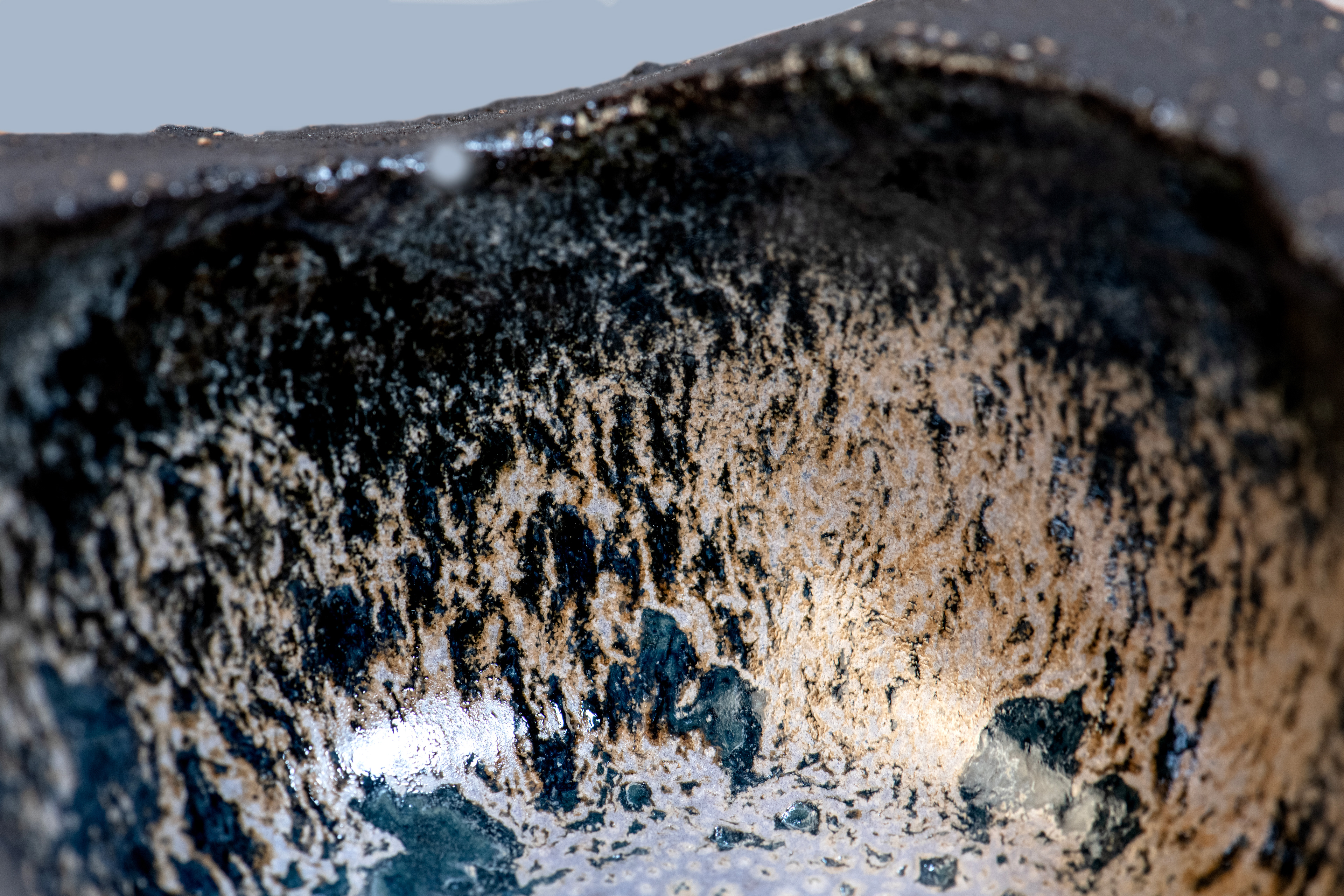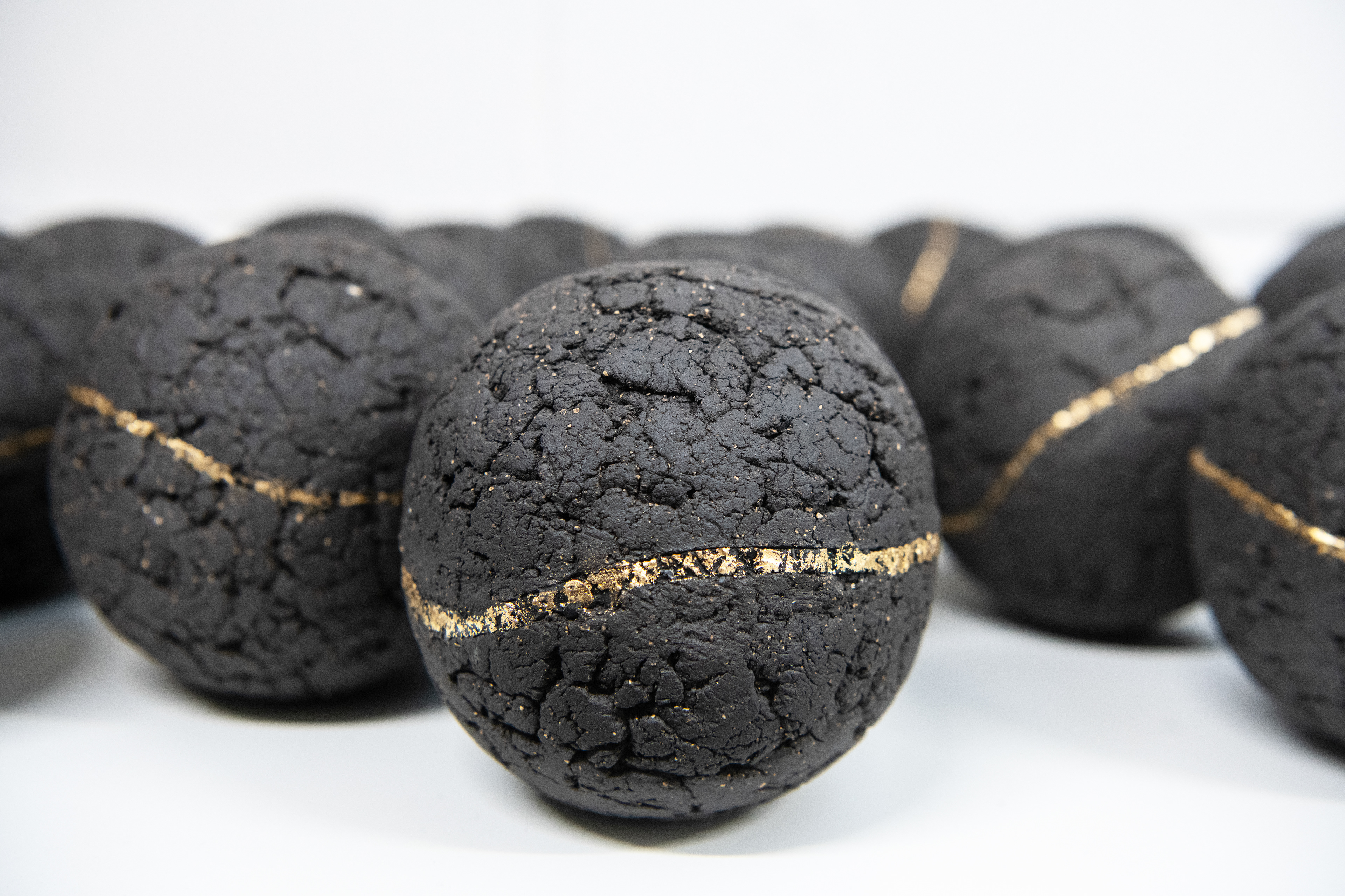 Crafted from textured black clay, the balls appear both earthly and otherworldly, as though they were discovered rather than made. Because the glaze remains hidden, Kernan believed it needed to be even more extraordinary than if it were visible. Over the course of a year, she tested 361 glaze combinations, selecting only 48 for the final works. The hidden vibrancy of these selected glazes raises the question, is the photograph ever truly enough?